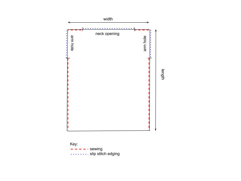 Pinning: Using safety pins, attach the two pieces at the top corners so that you can try on the garment. Pin it loosely at the sides, starting under the arms, and along the shoulders to allow for a neckline. If you prefer, you may very loosely stitch the garment together with contrasting yarn and a tapestry needle to see how it fits first, before doing the final sewing. Make sure the neck opening is large enough that you can remove the garment over your head.