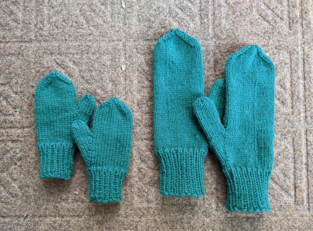 - Child and adult mittens, Tin Can Knits pattern (some rather rough worsted merino yarn)