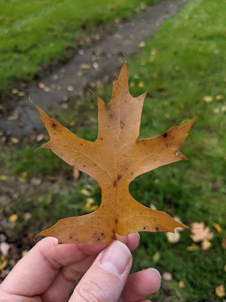 Back on my walk, I pick up a brown, spotty leaf and stick it on top of the stroller. Then, a red one with blackish splotches. A curled up dry one. Mottled yellow and orange ones. Torn and ratty ones. It feels a little forced and cheesy at first, like something you’re instructed to do in a little hardcover book about self-care and being happy. But I start to feel a little affection toward my odd leaves. Maybe a little protective.