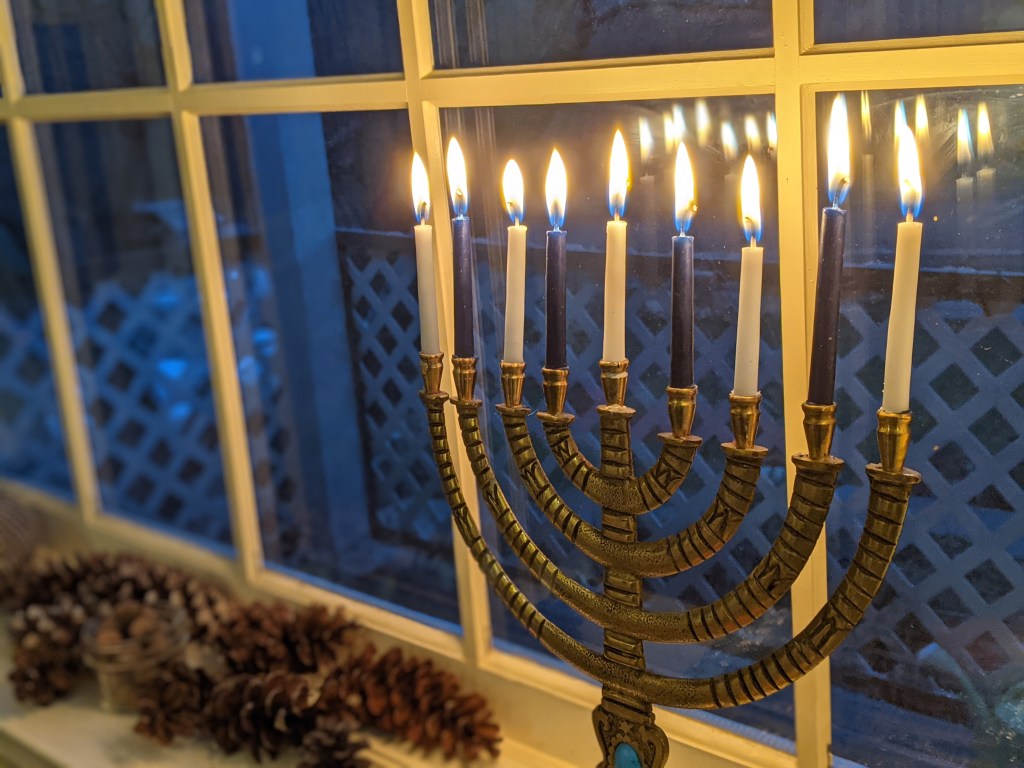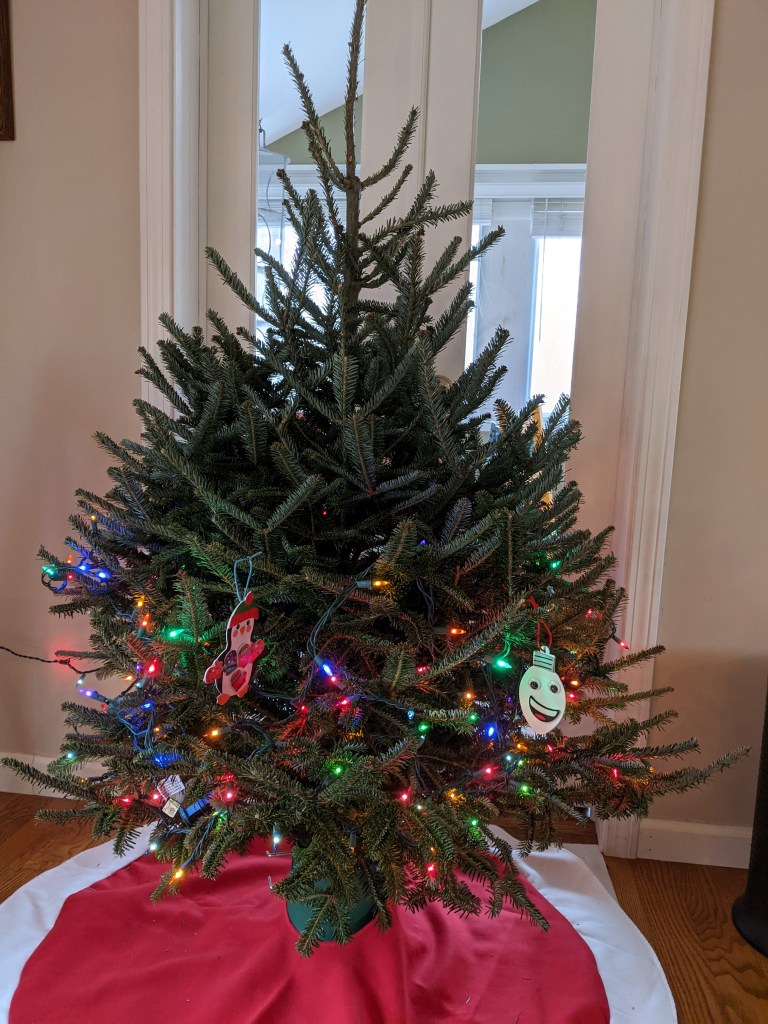 [Photos: We made it through all 8 days of Chanukah! Also, my half-lit Christmas tree with two ornaments on it.]